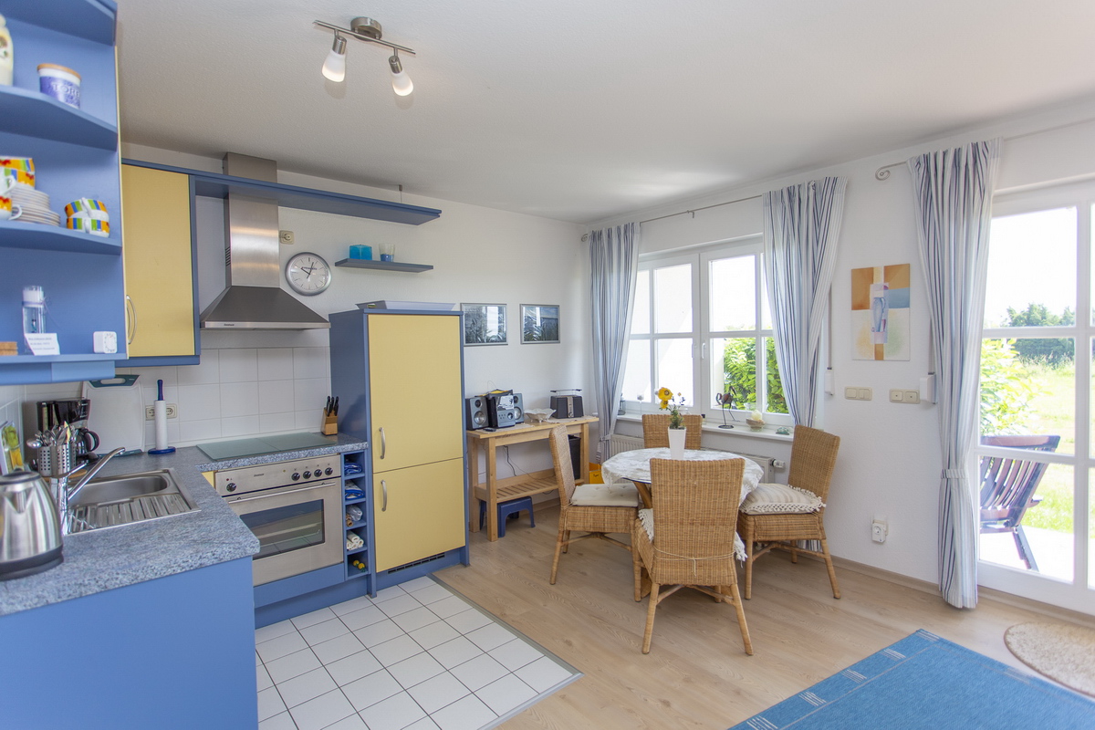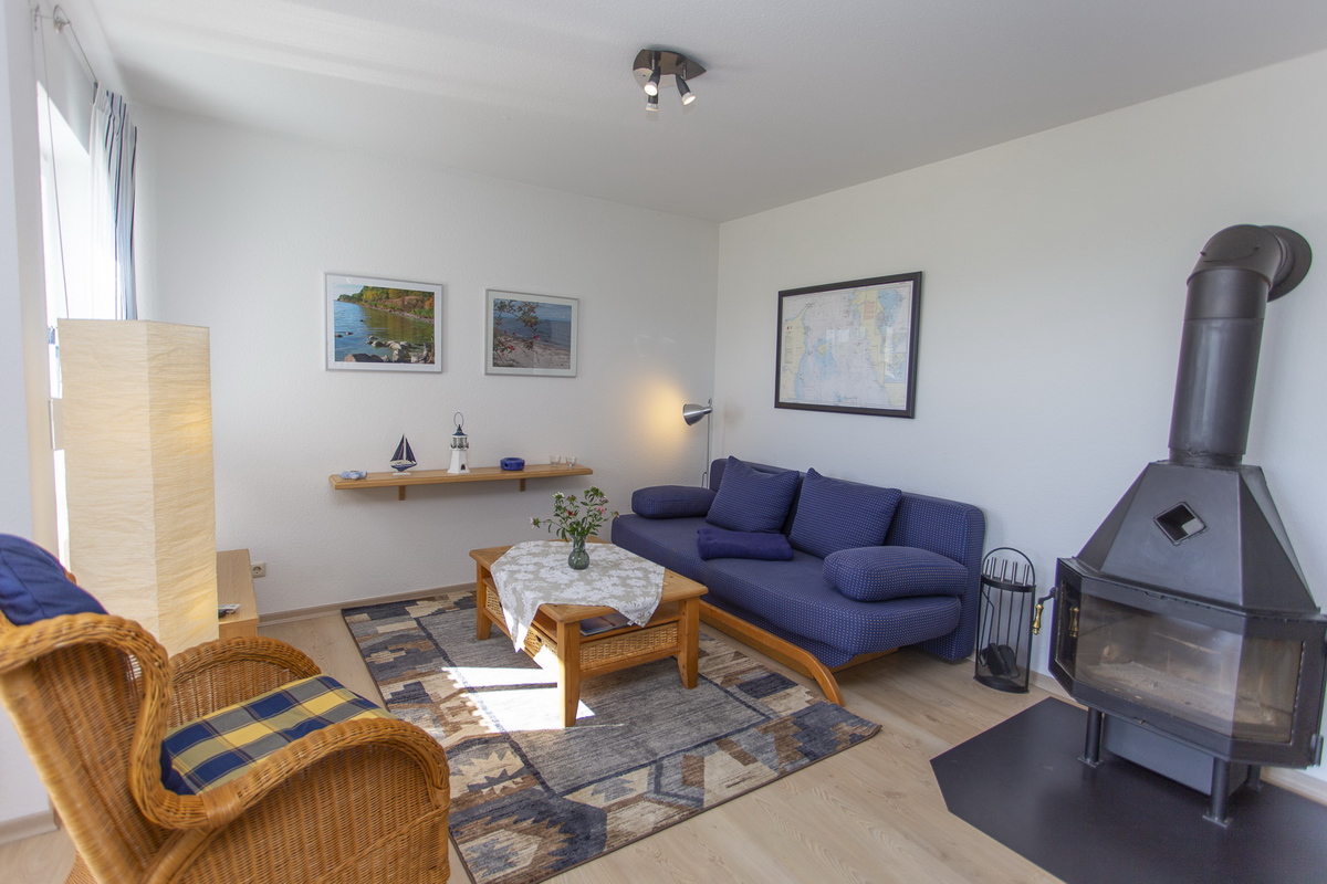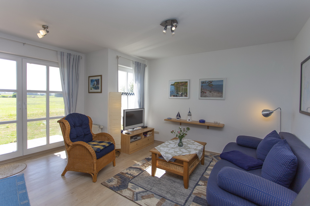 Gemütliche Ferienwohnung (ca. 55 m²) für 2 Personen im Erdgeschoss der Doppelhaushälfte mit direktem Zugang über die Terrasse zum Grundstück, das sich bis zum Bodden erstreckt. Unverbauter Boddenblick!