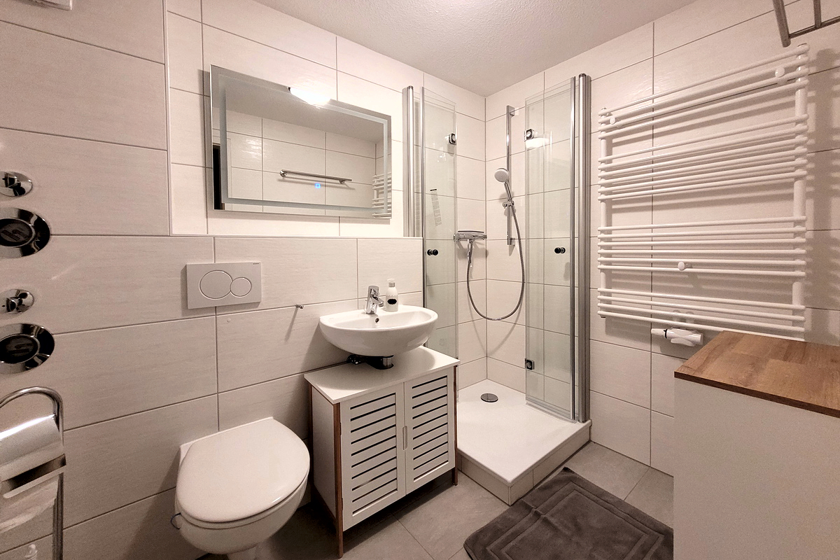 Schlafzimmer mit Doppelbett, geräumiges Wohnzimmer, SAT-Flachbild-Fernseher, WLAN, Radio/CD, Essecke mit offener und voll ausgestatteter Küche (Spülmaschine, Kühlschrank mit Gefrierfach, Cerankochfeld, Umluftbackofen, Mikrowelle), Bad mit Dusche und WC (2022 komplett saniert), bodentiefe Fensterfront zur Terrasse mit Gartenmöbeln und Grill, PKW-Stellplatz vor dem Haus.