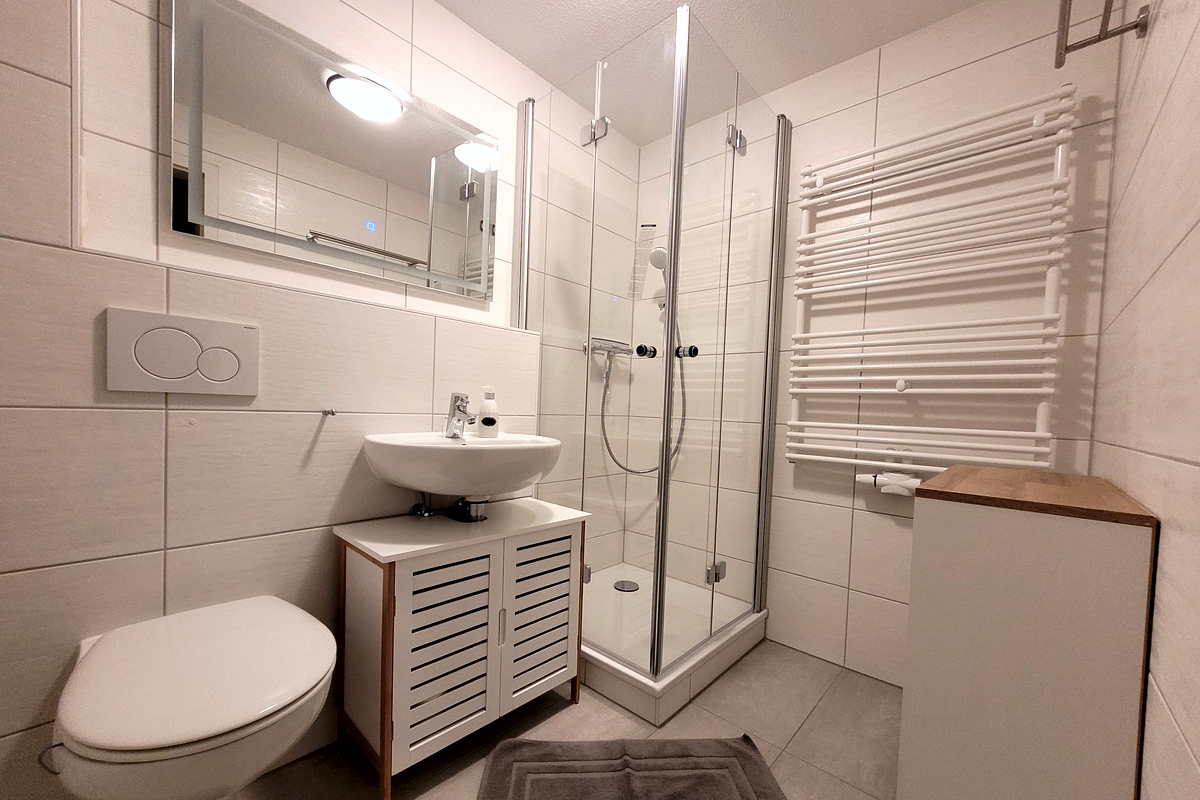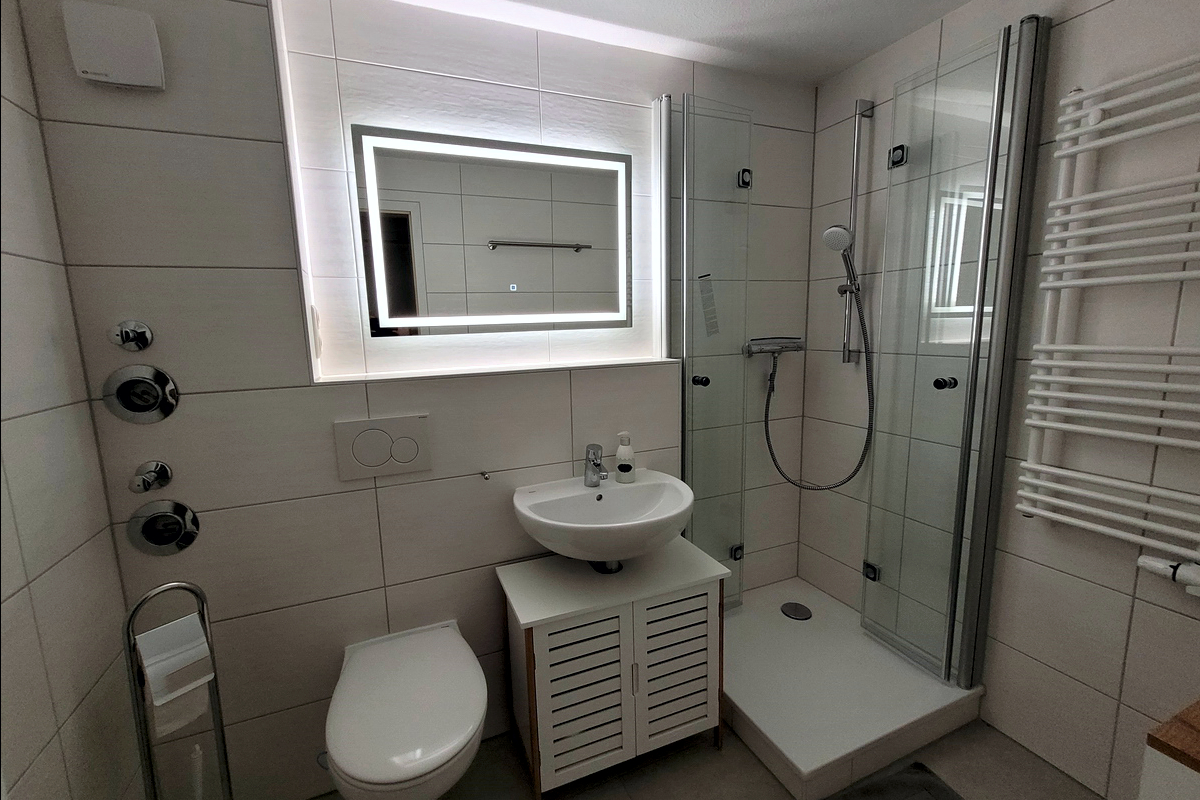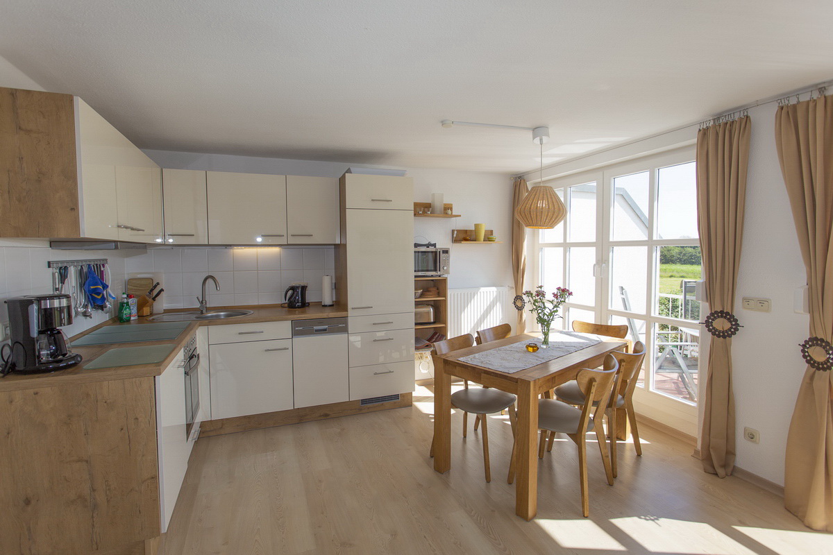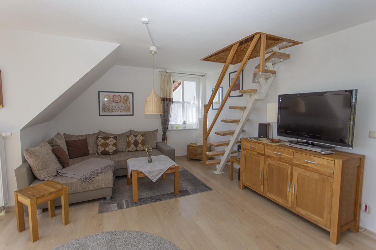 Schlaf­zim­mer mit Dop­pel­bett, zwei­tes Schlaf­zim­mer mit 2 Bet­ten im Spitz­bo­den, ge­räu­mi­ges Wohn­zim­mer mit SAT-Flach­bild-Fern­se­her, WLAN, Ra­dio/CD, Es­s­ecke mit of­fe­ner und voll aus­ge­stat­te­ter Kü­che (Spül­ma­schi­ne, Kühl­schrank mit Ge­frier­fach, Cer­an­koch­feld, Um­luft­back­ofen, Mikrowelle, Wasch­ma­schi­ne), Bad mit Du­sche und WC (2022 komplett saniert), gro­ße Fens­ter­front zum Bal­kon mit Gar­ten­mö­beln, PKW-Stell­platz vor dem Haus.