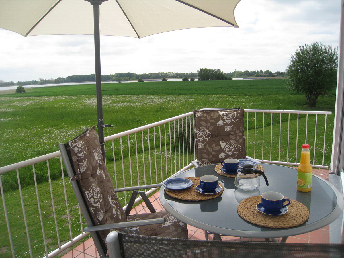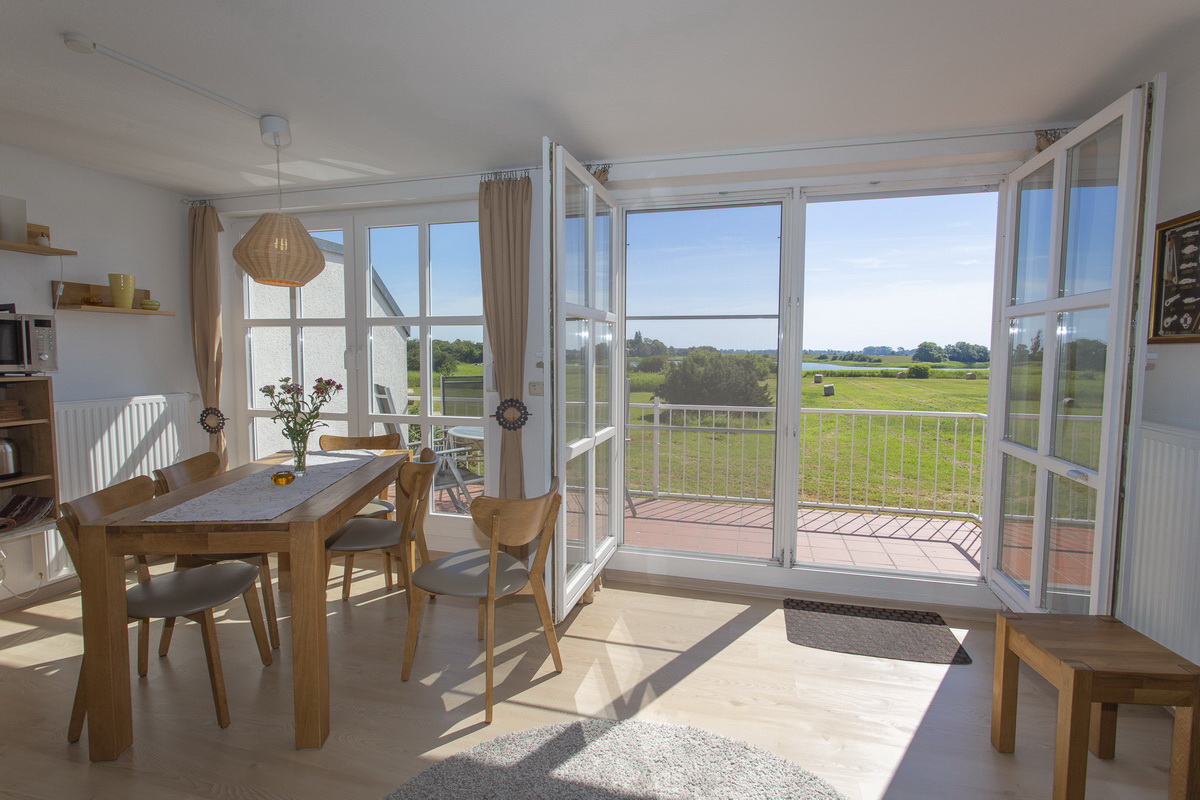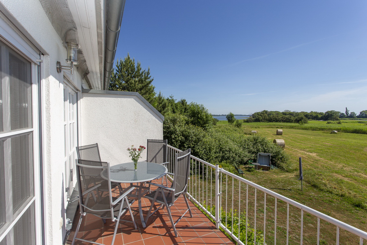Ge­müt­li­che Fe­ri­en­woh­nung für bis zu 4 Per­so­nen im Ober­ge­schoß und Dach­ge­schoß (ca. 65 m²) der Dop­pel­haus­hälf­te mit Bal­kon, der ei­nen herr­li­chen und un­ver­bau­ten Blick auf Wie­sen und Bo­dden bie­tet. Kei­ne Haus­tie­re.